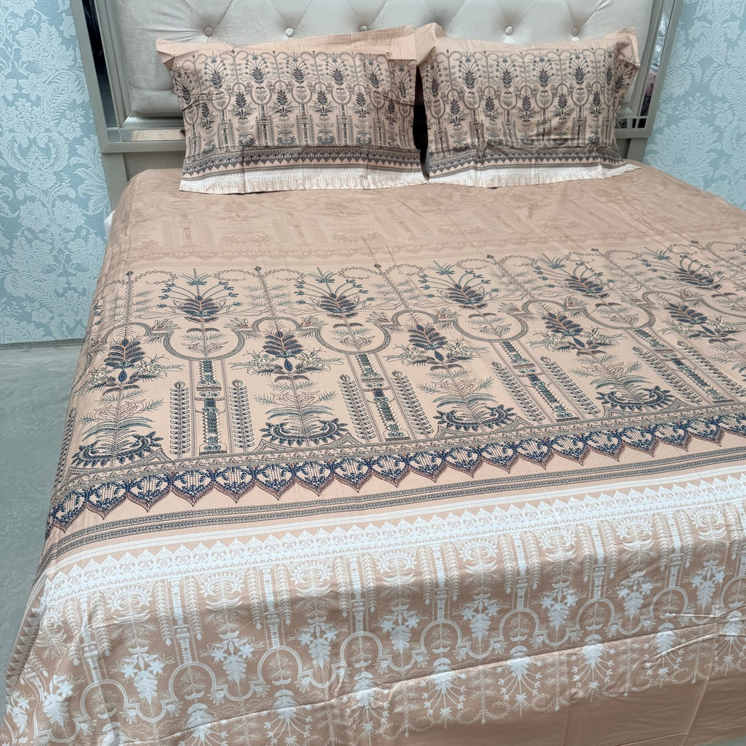 Elevate your bedroom with the ultimate in luxury and comfort. Our Super King Size Panel Design Bedding Set is crafted from 100% pure cotton, offering a soft, breathable, and high-quality feel that promises a perfect night's sleep. This full-print bed sheet set features a stunning panel design, adding a touch of sophistication and elegance to your space.